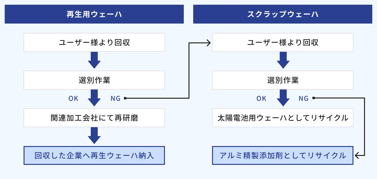 ユーザー様より発生する使用済みウェーハを回収し、再生ウェーハ、太陽電池用ウェーハ及びアルミ添加剤用として100%リサイクルを行うことにより、これまで産業廃棄物として処分していたウェーハを再資源化することの環境負荷低減活動を積極的に行っています。